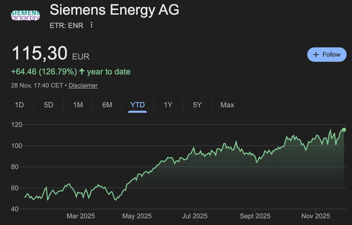 Siemens Energy has delivered a strong equity performance year-to-date, with the stock up approximately +127%, materially outperforming both European industrial peers and the broader market. The rerating has been driven by a combination of improving fundamentals and a significant reduction in perceived tail risks.