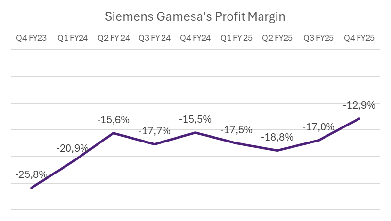 After conducting lengthy quality reviews, Siemens Gamesa temporarily halted sales of certain onshore models in 2024, removed third-party suppliers responsible for the faulty components, and has effectively entered a restructuring. Due to the long-term nature of contracts, negative effects persisted in 2025, but the management is expecting to reach breakeven in FY26 (with negative profitability margins in H1 FY26 turning positive in H2).